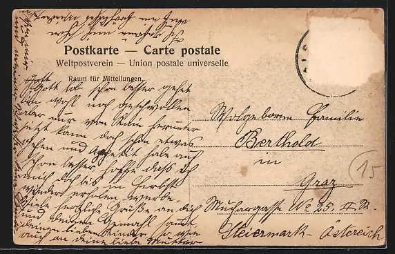 alte Ansichtskarte, gelaufen, Briefmarke entfernt, rückseitig Oberflächenschaden, Eckknick li. unten, guter Zustand