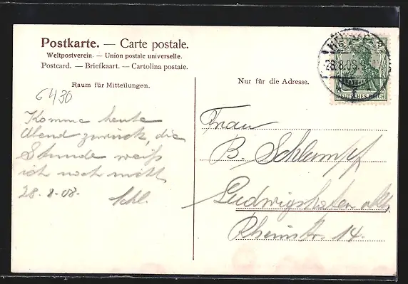 alte Ansichtskarte, gelaufen 1908, guter Zustand