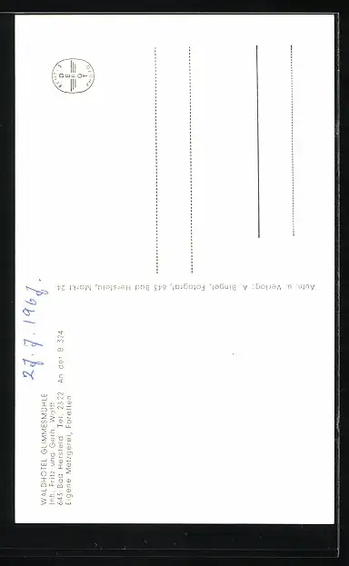 Personenbezogene Daten auf der Rückseite der Karte wurden durch blauen Textmarker unkenntlich gemacht. Die blauen Stellen sind auf die Vorderseite durchgeweicht und wirken sich negativ auf das Postkartenfoto aus