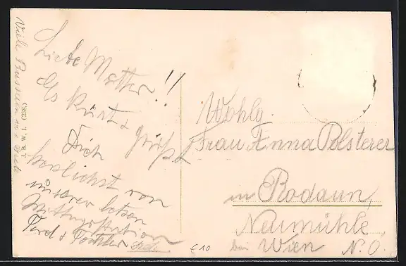 Personenbezogene Daten auf der Rückseite der Karte wurden durch blauen Textmarker unkenntlich gemacht. Die blauen Stellen sind auf die Vorderseite durchgeweicht und wirken sich negativ auf das Postkartenfoto aus