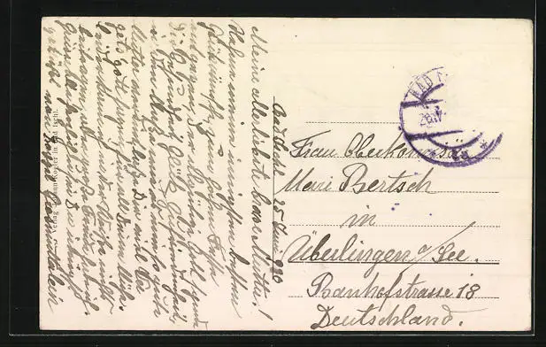 Personenbezogene Daten auf der Rückseite der Karte wurden durch blauen Textmarker unkenntlich gemacht. Die blauen Stellen sind auf die Vorderseite durchgeweicht und wirken sich negativ auf das Postkartenfoto aus
