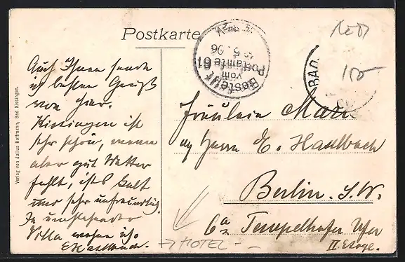 alte Ansichtskarte, gelaufen 1906, Briefmarke entfernt, rückseitig Oberflächenschaden, guter Zustand
