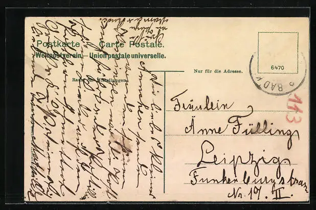 Personenbezogene Daten auf der Rückseite der Karte wurden durch blauen Textmarker unkenntlich gemacht. Die blauen Stellen sind auf die Vorderseite durchgeweicht und wirken sich negativ auf das Postkartenfoto aus