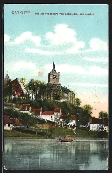 AK Bad Kleve, Blick auf die Schwanenburg vom See mit Ruderbooten