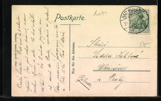Personenbezogene Daten auf der Rückseite der Karte wurden durch blauen Textmarker unkenntlich gemacht. Die blauen Stellen sind auf die Vorderseite durchgeweicht und wirken sich negativ auf das Postkartenfoto aus