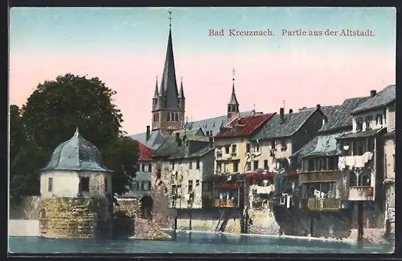 AK Bad Kreuznach, Partie aus der Altstadt mit Kirche