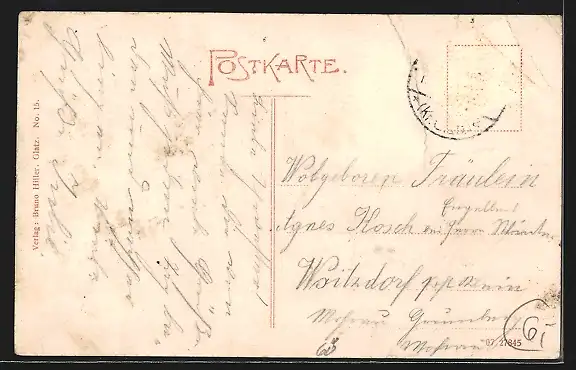 Personenbezogene Daten auf der Rückseite der Karte wurden durch blauen Textmarker unkenntlich gemacht. Die blauen Stellen sind auf die Vorderseite durchgeweicht und wirken sich negativ auf das Postkartenfoto aus