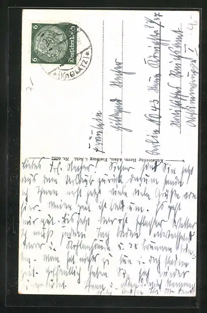 Personenbezogene Daten auf der Rückseite der Karte wurden durch blauen Textmarker unkenntlich gemacht. Die blauen Stellen sind auf die Vorderseite durchgeweicht und wirken sich negativ auf das Postkartenfoto aus