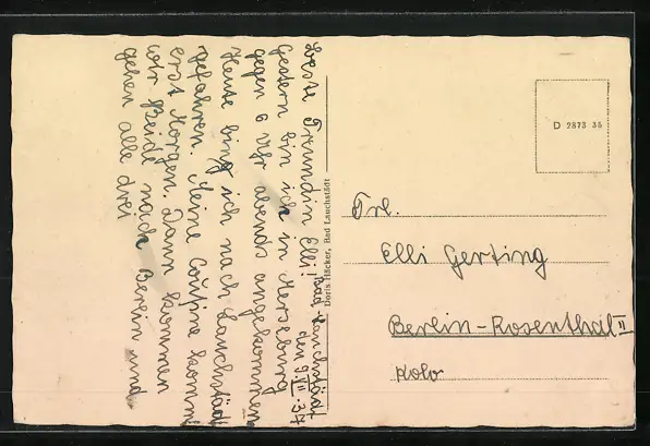 Personenbezogene Daten auf der Rückseite der Karte wurden durch blauen Textmarker unkenntlich gemacht. Die blauen Stellen sind auf die Vorderseite durchgeweicht und wirken sich negativ auf das Postkartenfoto aus