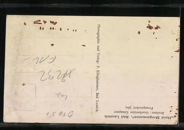 Personenbezogene Daten auf der Rückseite der Karte wurden durch blauen Textmarker unkenntlich gemacht. Die blauen Stellen sind auf die Vorderseite durchgeweicht und wirken sich negativ auf das Postkartenfoto aus