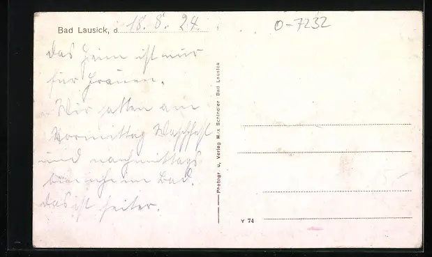 Personenbezogene Daten auf der Rückseite der Karte wurden durch blauen Textmarker unkenntlich gemacht. Die blauen Stellen sind auf die Vorderseite durchgeweicht und wirken sich negativ auf das Postkartenfoto aus