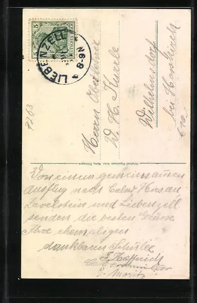 Personenbezogene Daten auf der Rückseite der Karte wurden durch blauen Textmarker unkenntlich gemacht. Die blauen Stellen sind auf die Vorderseite durchgeweicht und wirken sich negativ auf das Postkartenfoto aus