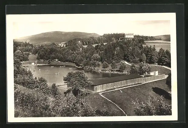 AK Bad Liebwerda / Lazne Libverda, Schwimmbad aus der Vogelschau