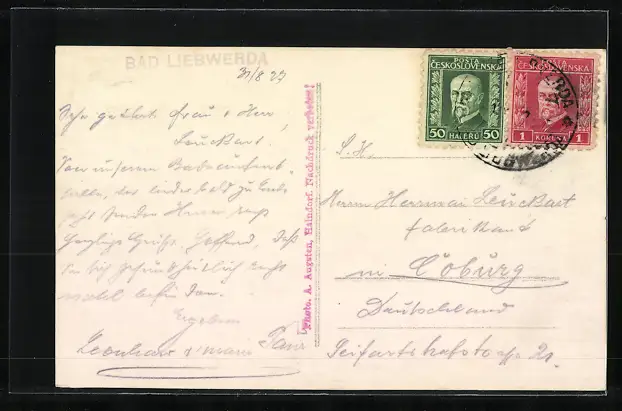 Personenbezogene Daten auf der Rückseite der Karte wurden durch blauen Textmarker unkenntlich gemacht. Die blauen Stellen sind auf die Vorderseite durchgeweicht und wirken sich negativ auf das Postkartenfoto aus