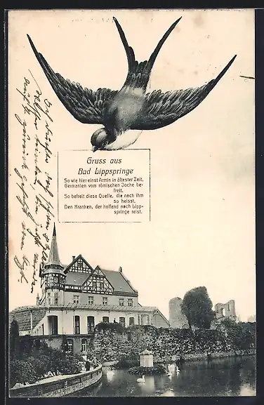 AK Bad Lippspringe, Heilquelle, darüber Schwalbe mit Vers