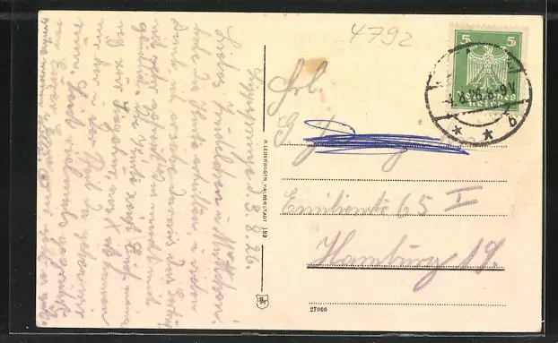 Personenbezogene Daten auf der Rückseite der Karte wurden durch blauen Textmarker unkenntlich gemacht. Die blauen Stellen sind auf die Vorderseite durchgeweicht und wirken sich negativ auf das Postkartenfoto aus