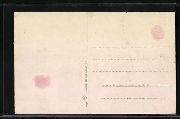 Personenbezogene Daten auf der Rückseite der Karte wurden durch blauen Textmarker unkenntlich gemacht. Die blauen Stellen sind auf die Vorderseite durchgeweicht und wirken sich negativ auf das Postkartenfoto aus