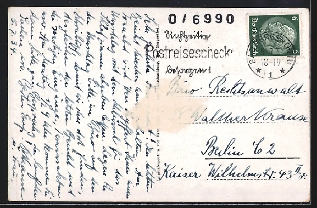 Personenbezogene Daten auf der Rückseite der Karte wurden durch blauen Textmarker unkenntlich gemacht. Die blauen Stellen sind auf die Vorderseite durchgeweicht und wirken sich negativ auf das Postkartenfoto aus