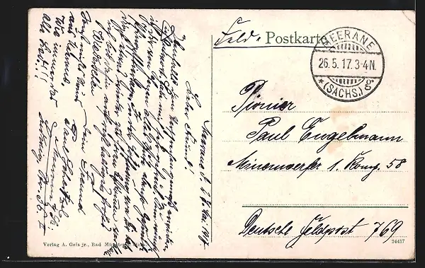 alte Ansichtskarte, gelaufen 1917, Eckknick oben li., Bugspur unten li., guter Zustand