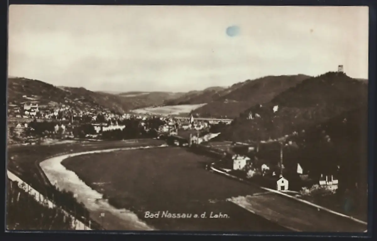 AK Bad Nassau a. d. Lahn, Panorama mit Lahn und Burgruine
