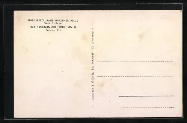 Personenbezogene Daten auf der Rückseite der Karte wurden durch blauen Textmarker unkenntlich gemacht. Die blauen Stellen sind auf die Vorderseite durchgeweicht und wirken sich negativ auf das Postkartenfoto aus