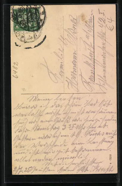 Personenbezogene Daten auf der Rückseite der Karte wurden durch blauen Textmarker unkenntlich gemacht. Die blauen Stellen sind auf die Vorderseite durchgeweicht und wirken sich negativ auf das Postkartenfoto aus
