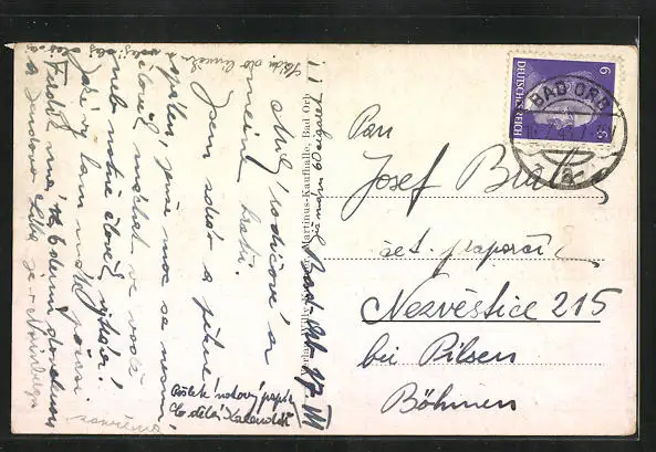 Personenbezogene Daten auf der Rückseite der Karte wurden durch blauen Textmarker unkenntlich gemacht. Die blauen Stellen sind auf die Vorderseite durchgeweicht und wirken sich negativ auf das Postkartenfoto aus