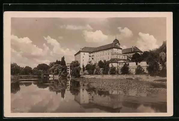AK Bad Podiebrad / Podebrady, Uferpartie mit Gebäudeansicht