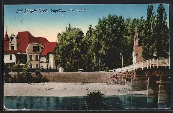 AK Bad Pöstyen, Ortspartie mit Brücke, Waagtal