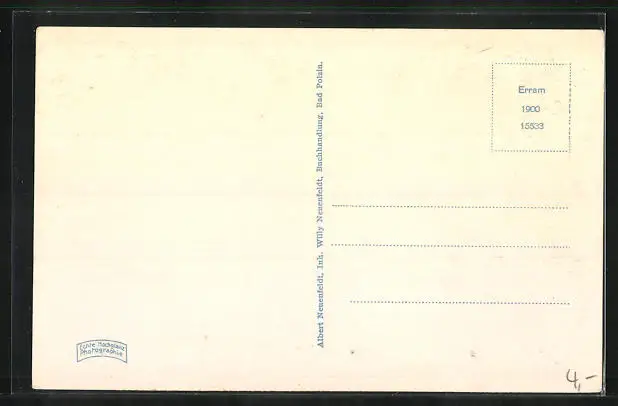 Personenbezogene Daten auf der Rückseite der Karte wurden durch blauen Textmarker unkenntlich gemacht. Die blauen Stellen sind auf die Vorderseite durchgeweicht und wirken sich negativ auf das Postkartenfoto aus