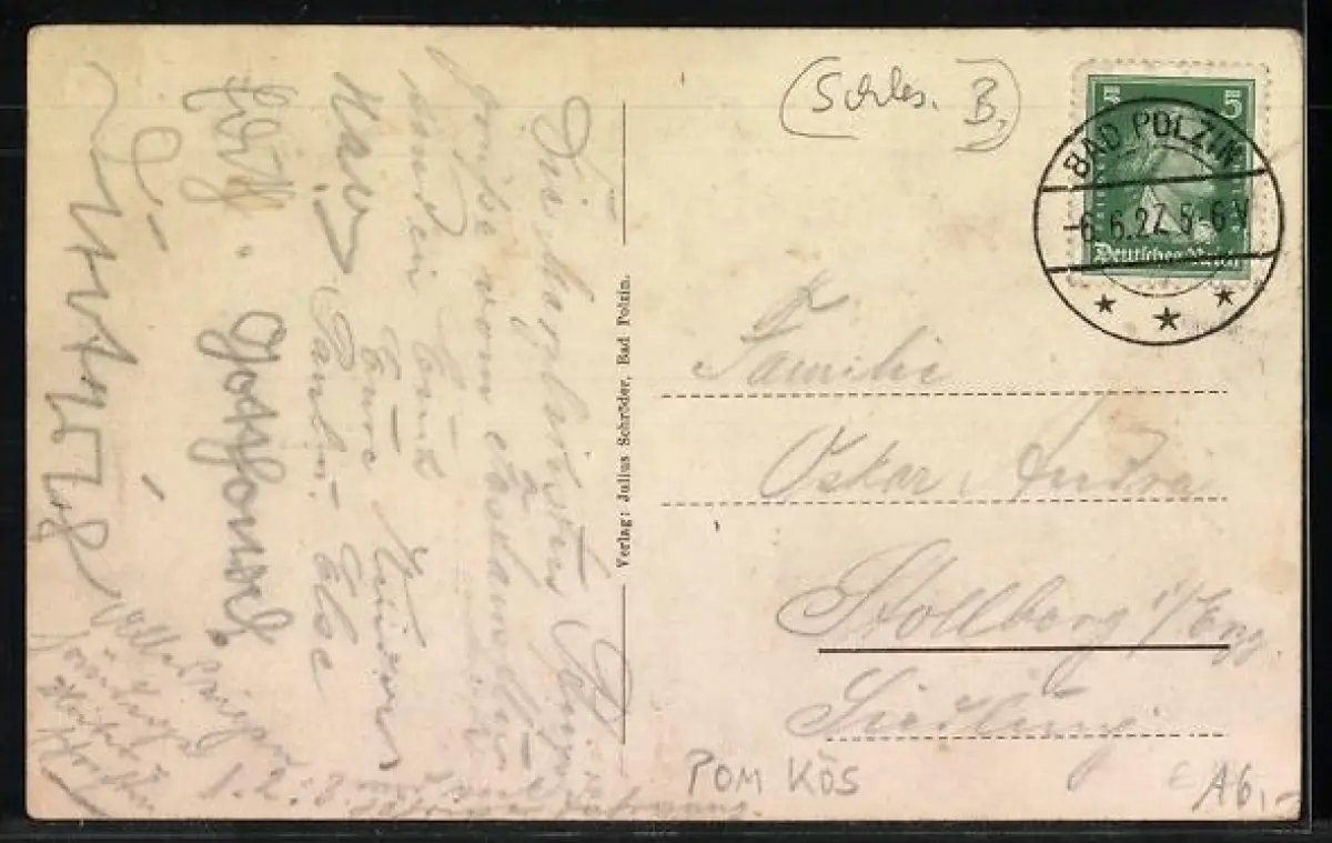 Personenbezogene Daten auf der Rückseite der Karte wurden durch blauen Textmarker unkenntlich gemacht. Die blauen Stellen sind auf die Vorderseite durchgeweicht und wirken sich negativ auf das Postkartenfoto aus
