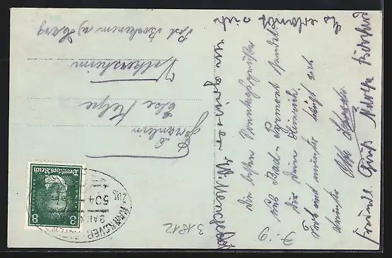 Personenbezogene Daten auf der Rückseite der Karte wurden durch blauen Textmarker unkenntlich gemacht. Die blauen Stellen sind auf die Vorderseite durchgeweicht und wirken sich negativ auf das Postkartenfoto aus