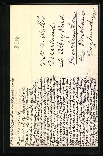 Personenbezogene Daten auf der Rückseite der Karte wurden durch blauen Textmarker unkenntlich gemacht. Die blauen Stellen sind auf die Vorderseite durchgeweicht und wirken sich negativ auf das Postkartenfoto aus