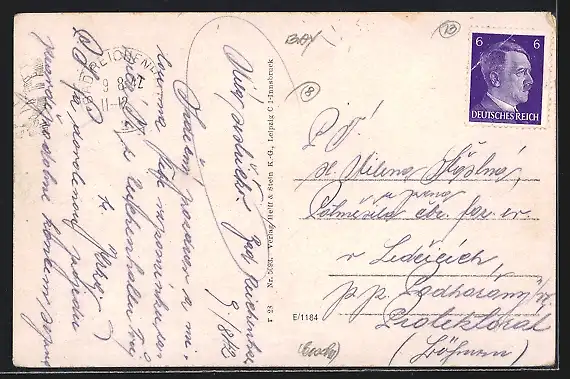 Personenbezogene Daten auf der Rückseite der Karte wurden durch blauen Textmarker unkenntlich gemacht. Die blauen Stellen sind auf die Vorderseite durchgeweicht und wirken sich negativ auf das Postkartenfoto aus