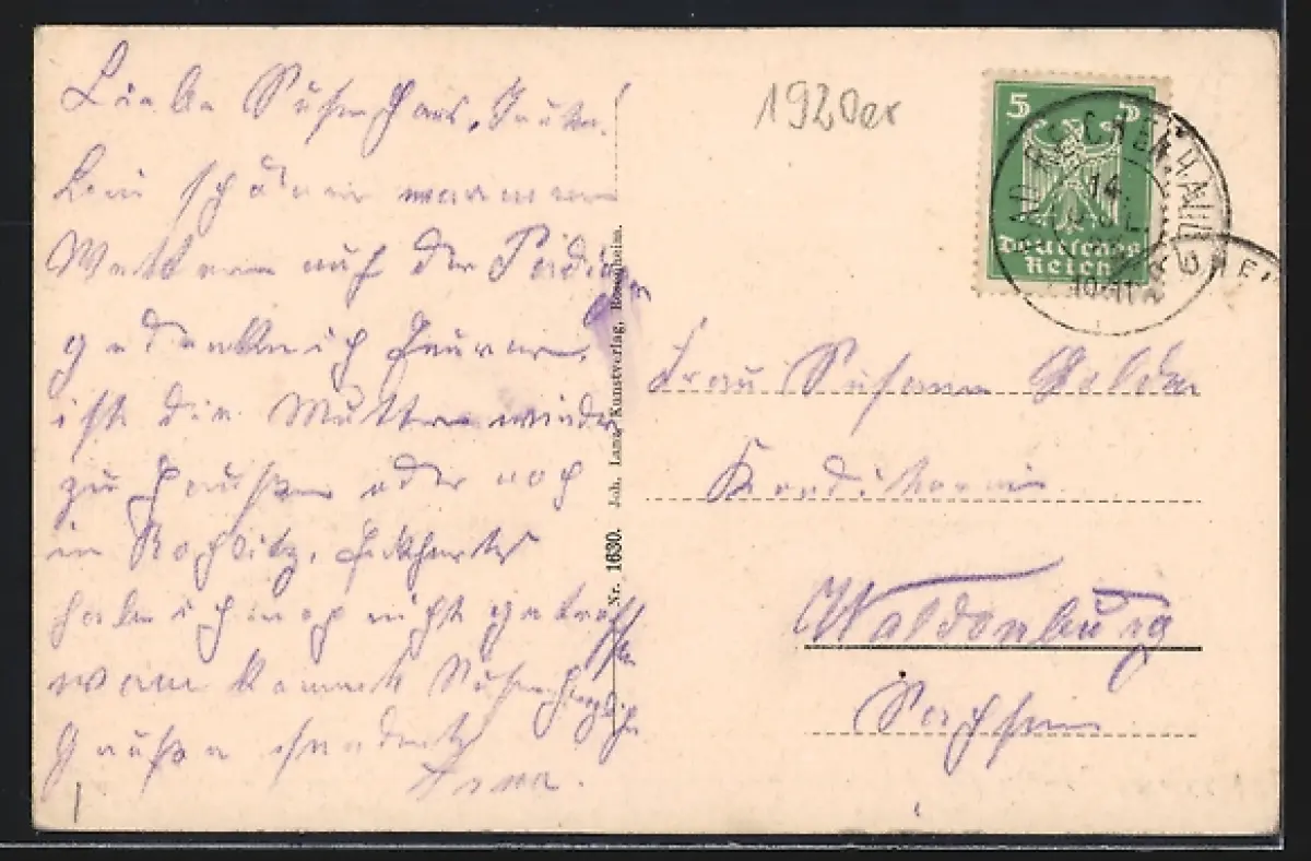 Personenbezogene Daten auf der Rückseite der Karte wurden durch blauen Textmarker unkenntlich gemacht. Die blauen Stellen sind auf die Vorderseite durchgeweicht und wirken sich negativ auf das Postkartenfoto aus