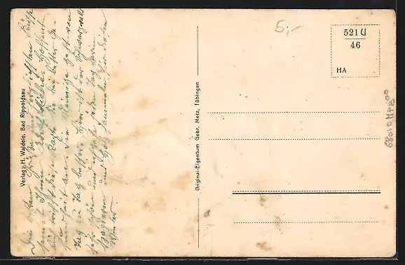 Personenbezogene Daten auf der Rückseite der Karte wurden durch blauen Textmarker unkenntlich gemacht. Die blauen Stellen sind auf die Vorderseite durchgeweicht und wirken sich negativ auf das Postkartenfoto aus