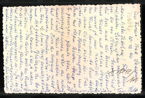 Personenbezogene Daten auf der Rückseite der Karte wurden durch blauen Textmarker unkenntlich gemacht. Die blauen Stellen sind auf die Vorderseite durchgeweicht und wirken sich negativ auf das Postkartenfoto aus