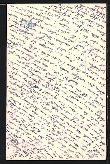 Personenbezogene Daten auf der Rückseite der Karte wurden durch blauen Textmarker unkenntlich gemacht. Die blauen Stellen sind auf die Vorderseite durchgeweicht und wirken sich negativ auf das Postkartenfoto aus