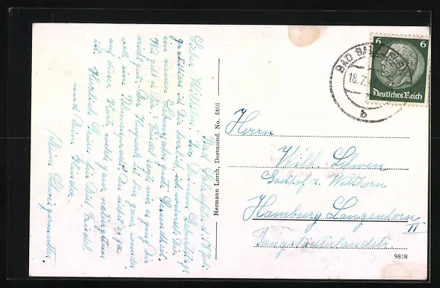 Personenbezogene Daten auf der Rückseite der Karte wurden durch blauen Textmarker unkenntlich gemacht. Die blauen Stellen sind auf die Vorderseite durchgeweicht und wirken sich negativ auf das Postkartenfoto aus