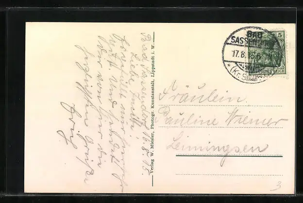 Personenbezogene Daten auf der Rückseite der Karte wurden durch blauen Textmarker unkenntlich gemacht. Die blauen Stellen sind auf die Vorderseite durchgeweicht und wirken sich negativ auf das Postkartenfoto aus