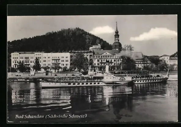 AK Bad Schandau /Sächs. Schweiz, Ortspartie mit Elbansicht und Dampfer Leipzig