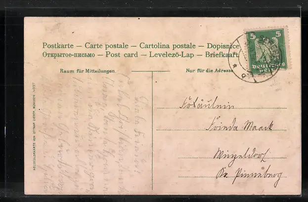alte Ansichtskarte, gelaufen 1924, minimaler Einriss re. oben, guter Zustand