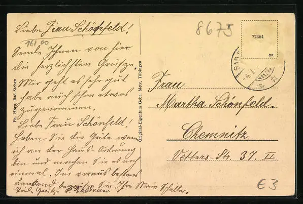 Personenbezogene Daten auf der Rückseite der Karte wurden durch blauen Textmarker unkenntlich gemacht. Die blauen Stellen sind auf die Vorderseite durchgeweicht und wirken sich negativ auf das Postkartenfoto aus