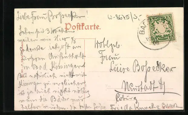 Personenbezogene Daten auf der Rückseite der Karte wurden durch blauen Textmarker unkenntlich gemacht. Die blauen Stellen sind auf die Vorderseite durchgeweicht und wirken sich negativ auf das Postkartenfoto aus
