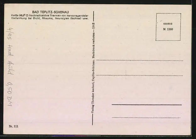 Personenbezogene Daten auf der Rückseite der Karte wurden durch blauen Textmarker unkenntlich gemacht. Die blauen Stellen sind auf die Vorderseite durchgeweicht und wirken sich negativ auf das Postkartenfoto aus