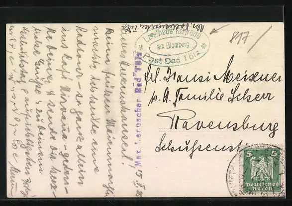 Personenbezogene Daten auf der Rückseite der Karte wurden durch blauen Textmarker unkenntlich gemacht. Die blauen Stellen sind auf die Vorderseite durchgeweicht und wirken sich negativ auf das Postkartenfoto aus