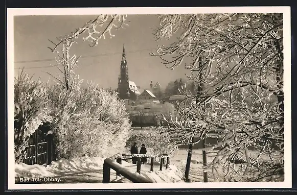AK Bad Tölz /Obbay., Ortspartie mit Kirche im Schnee