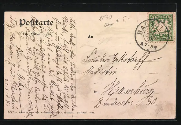 Personenbezogene Daten auf der Rückseite der Karte wurden durch blauen Textmarker unkenntlich gemacht. Die blauen Stellen sind auf die Vorderseite durchgeweicht und wirken sich negativ auf das Postkartenfoto aus
