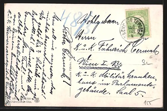 Personenbezogene Daten auf der Rückseite der Karte wurden durch blauen Textmarker unkenntlich gemacht. Die blauen Stellen sind auf die Vorderseite durchgeweicht und wirken sich negativ auf das Postkartenfoto aus