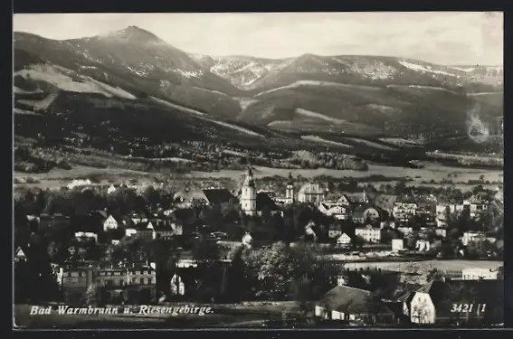 AK Bad Warmbrunn, Ortsansicht mit Riesengebirge